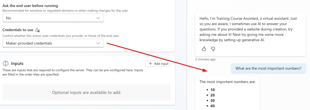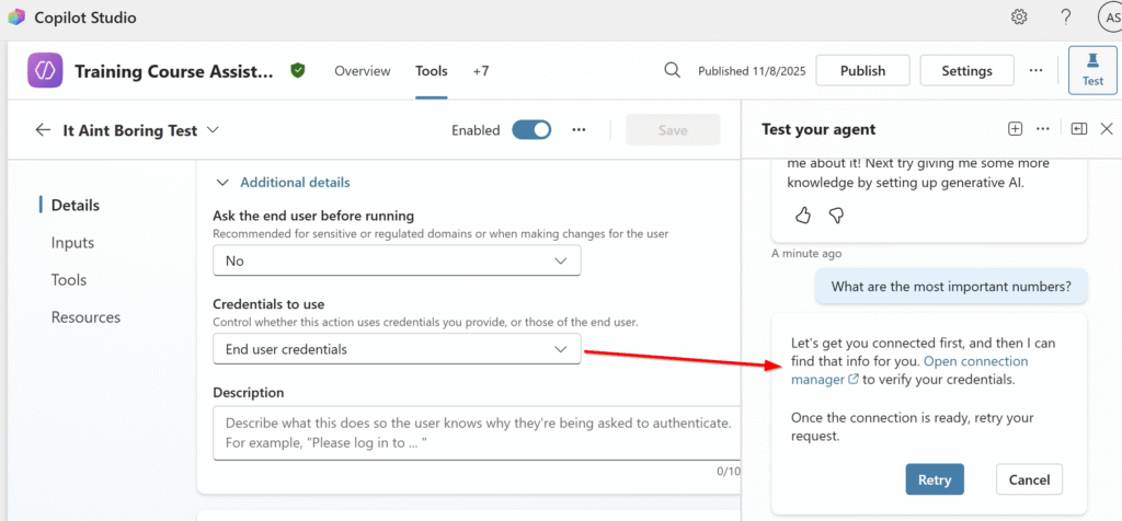 Now I do understand that, with the “Maker-provided credentials” selected, the agent does not need me to connect anymore. I don’t quite understand why it kept asking me to connect with the other options selected, even though I did have an active connection. Anyways… if you get stuck on the same issue wondering what’s going on, this might help.