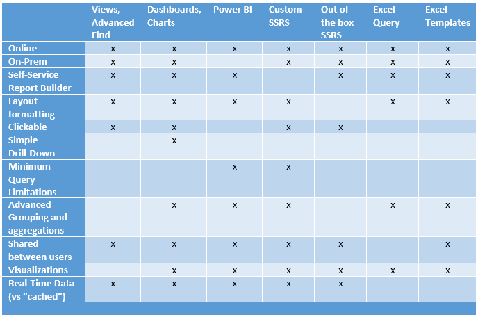 In other words, we are talking about SSRS, Dashboards, and Power BI. Realistically, though, dashboards are nothing but layout pages where we can add charts and views, so we should really be talking about charts and views there. Also, Power BI is somewhat limited in the on-prem environments, and SSRS is somewhat limited in the online environments.