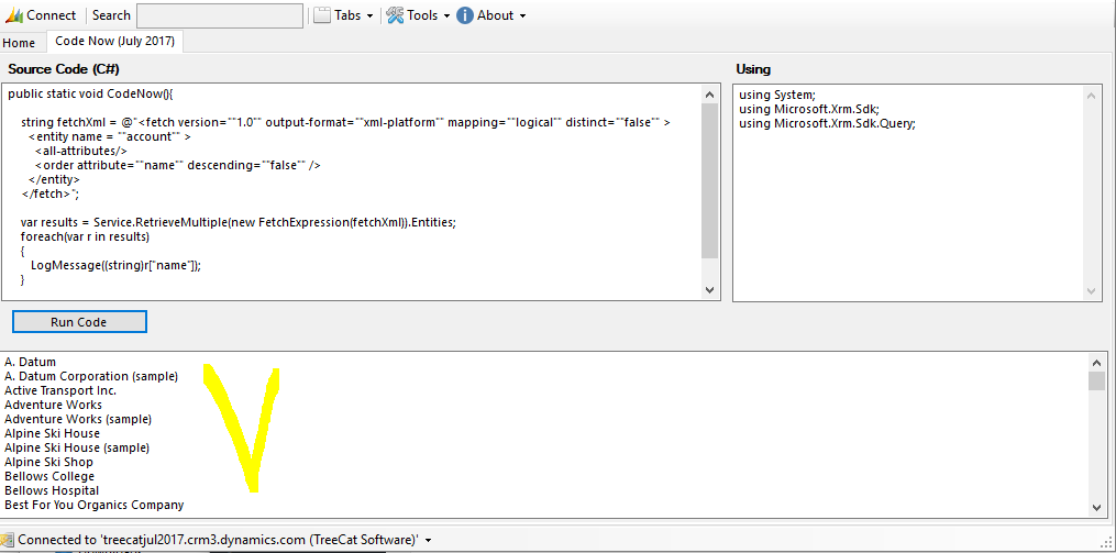 6. You can, actually, hit “Run Code” – the code will run and it will print account names for all accounts in your Dynamics organization