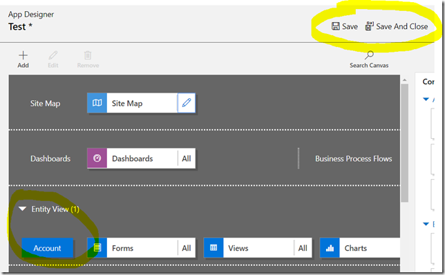Saved and closed the sitemap – notice how account entity has been added to the app, too. I still have to hit save/publish there, but the entity has been added already (not sure how comes “Save” is required at that point, but it is. Even though I can close the app at this point without saving, then open it.. then hit “Save”):